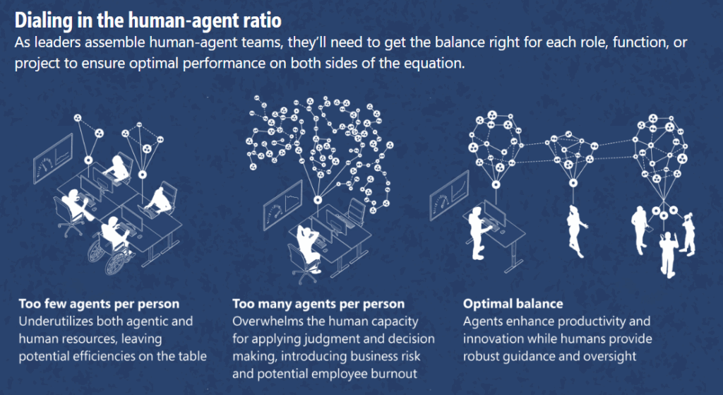 Maximising the effectiveness of these human-agent teams requires a new metric: the human-agent ratio. Leaders need to consider how many agents are required for specific roles and tasks to strike the right balance. And crucially, how many humans are required to guide, oversee, and collaborate with these agents? The optimal ratio will be highly task-specific and will require careful consideration. Organizations need to identify situations where a mix of human and digital labor can surpass AI alone. This is crucial when customers want a personal touch or when society demands human accountability for key decisions, especially in product launches or financial strategies. Balancing human staff and digital agents will change how work is performed and success is measured in the future.