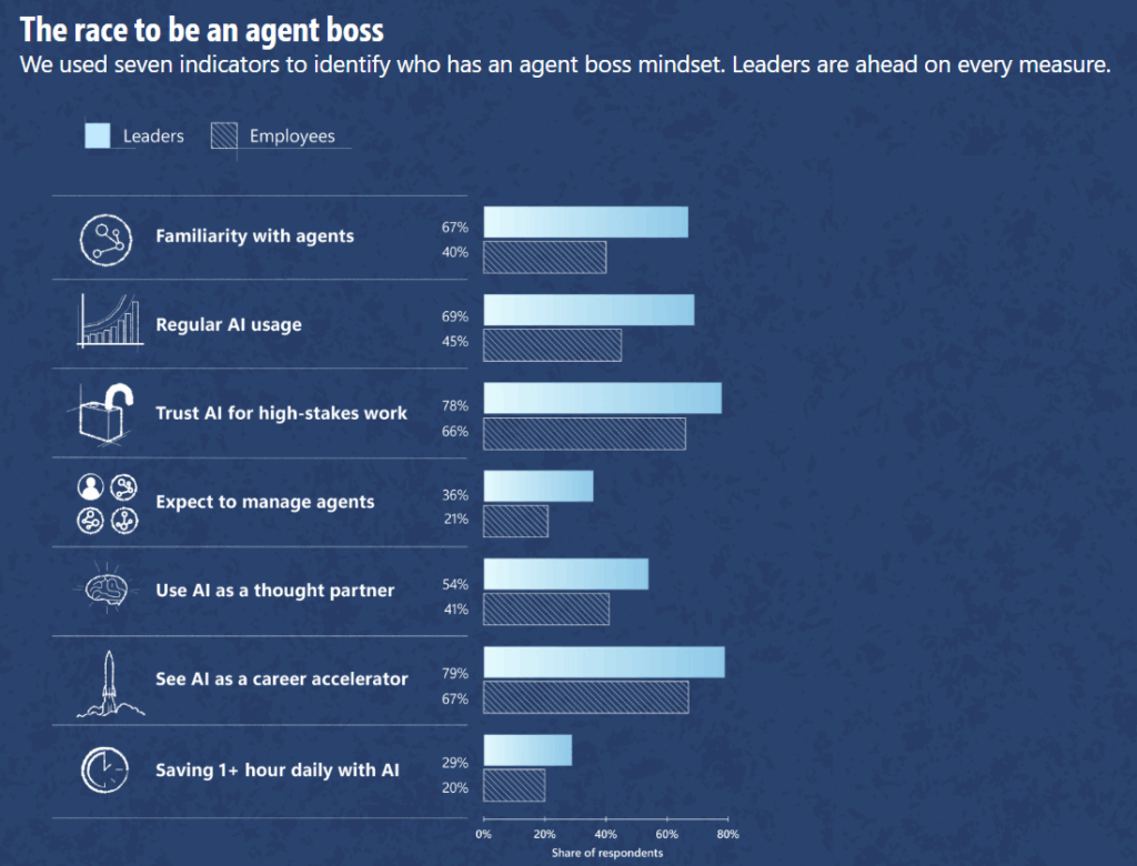 For individuals willing to embrace this change and lean into AI, it presents a powerful opportunity for career acceleration. However, the sources indicate that leaders currently have a head start. Leaders consistently surpass employees in the “agent boss mindset” across seven indicators, such as usage, trust, and perceived career impact. 67% of leaders know about agents, while only 40% of employees do. Additionally, 79% of leaders believe AI will boost their careers, compared to 67% of employees.